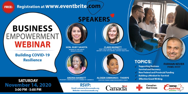 Are you a small, medium, or large enterprise owner or have you been thinking about starting a business in Canada? The Kenyan Canadian Association in partnership with the Federal government and the Canadian Red Cross is hosting a one of a kind COVID-19 Business Empowerment Webinar.
